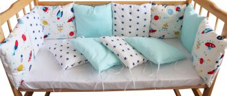 Обязательное условие – плотный и ровный матрац, желательно ортопедический. Лучше позаботиться заранее о сменном чехле на него, поскольку у детей с рождения появляется просто удивительная способность все пачкать и мочить. Застилать кроватку лучше тонкими пеленками, а не простынями. Их удобнее и легче стирать. Обычно покупают 2-3 комплекта постельного белья, в то время как пеленок делается гораздо больший запас. Сменить грязную пеленку не составит труда. Подушки не нужны, даже пеленка, сложенная в несколько раз, под голову не требуется.